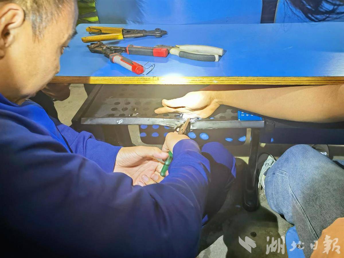 男生坐在教室后排,他的手指已出现充血肿胀。由于课桌下方的金属底板质地坚硬,消防员决定选择靠近被卡手指的边缘处,使用剪切钳对金属底板进行剪切。