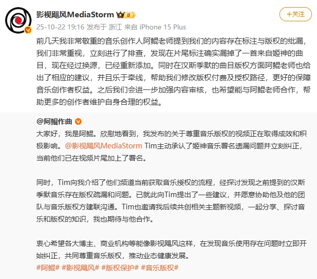 “前几天我非常敬重的音乐创作人阿鲲老师提到我们的内容存在标注与版权的纰漏,我们非常重视,立刻进行了排查,发现在片尾标注确实漏掉了一首来自姬神的曲目,现在经过换源,已经重新添加。同时在汉斯季默的曲目版权方面阿鲲老师也给出了相应的建议,并且乐于牵线,帮助我们修改版权付费及授权路径,更好的保障音乐创作者权益。之后我们会进一步加强内容审核,也希望能与阿鲲老师合作,帮助更多的创作者维护自身合理的权益。”