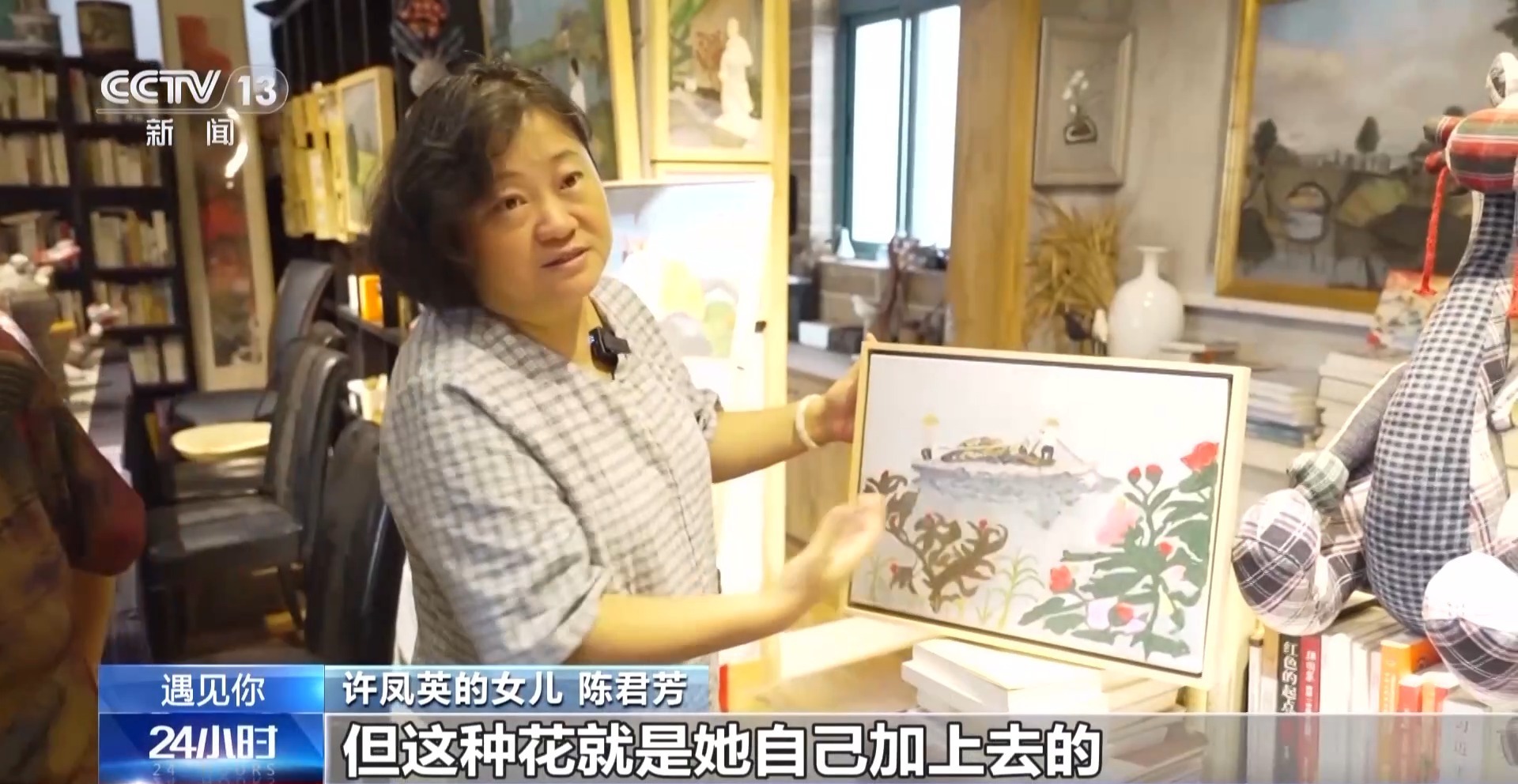 许凤英的女儿 陈君芳:这是常见的农村的景色,一条船在清淤,但这种花就是她自己加上去的。所以我妈妈的内心是特别美好的,你看她总想把美的东西往上加。