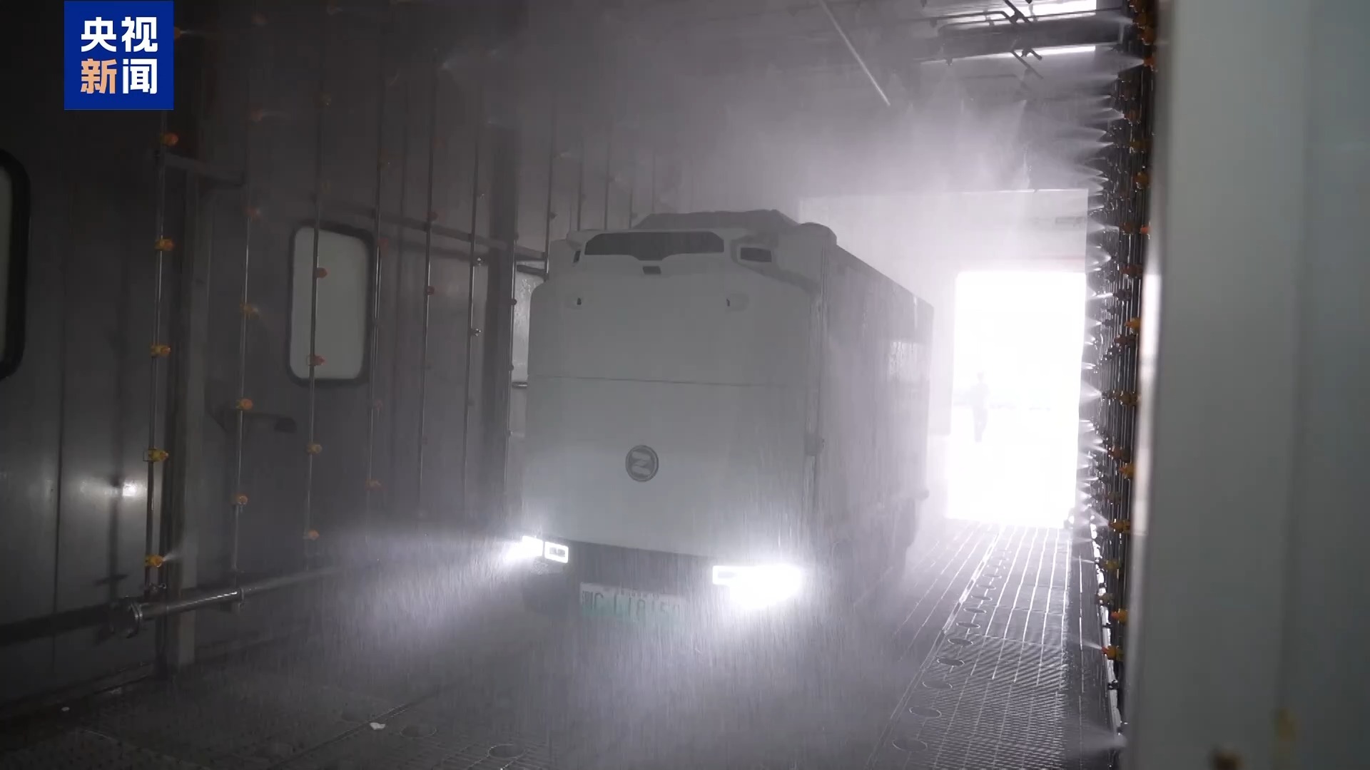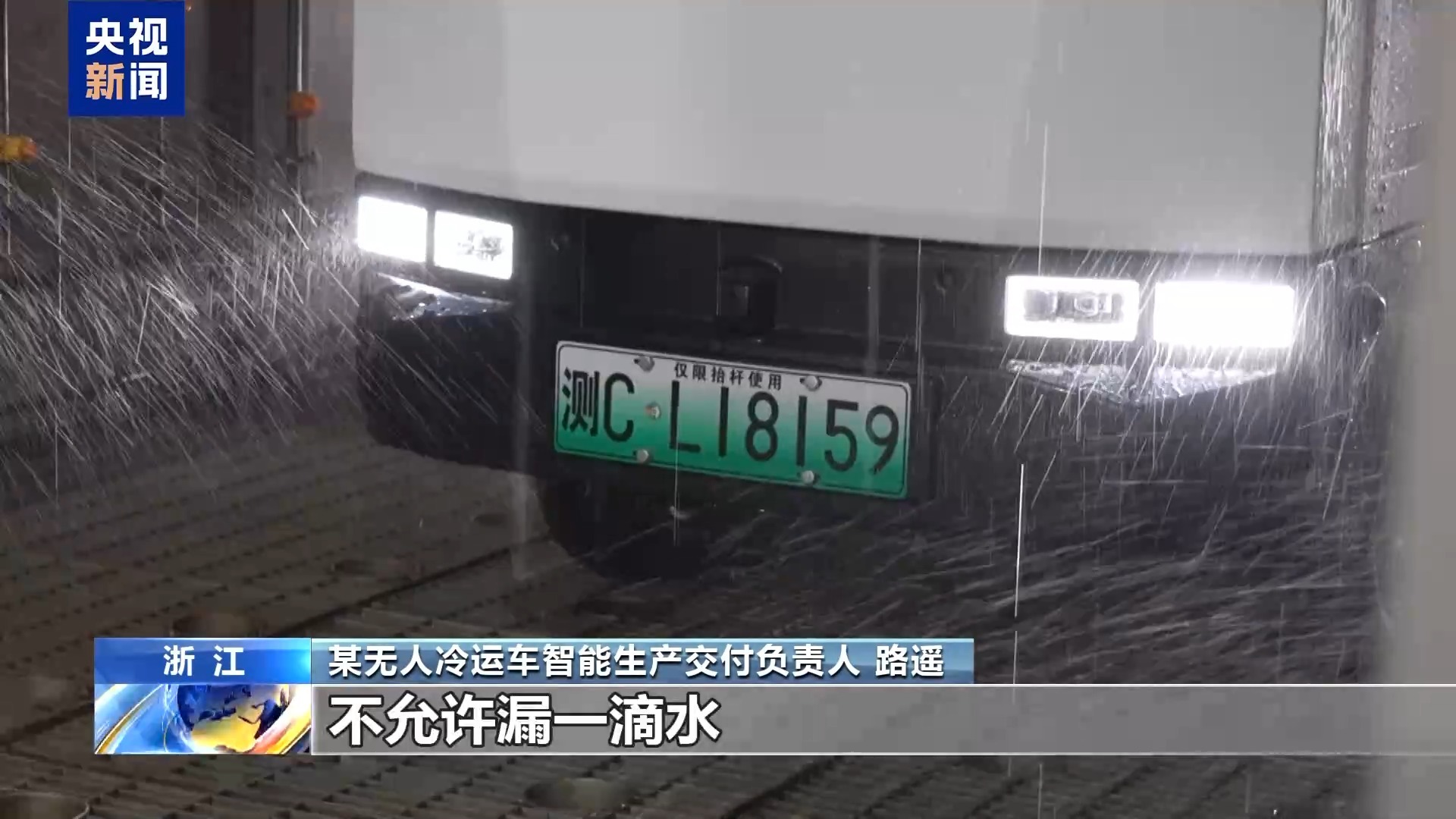 某无人冷运车智能生产交付负责人 路遥:现在无人车正在进行的是按照国标五倍流量的标准进行的强化淋雨测试,我们的无人冷运车在极端环境下不允许漏一滴水,渗也是不允许的。