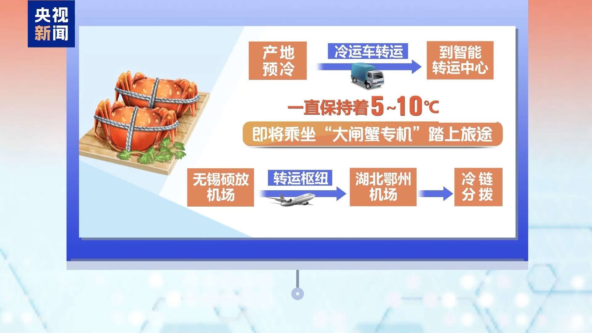 从产地预冷到冷运车转运,再到智能转运中心,此时,一直保持着5~10℃的大闸蟹即将乘坐“大闸蟹专机”踏上旅途,从无锡硕放机场起飞,进入湖北鄂州机场转运枢纽后进行冷链分拨。来自阳澄湖的大闸蟹将在24小时之内抵达相隔1700公里之外的目的地——哈尔滨。