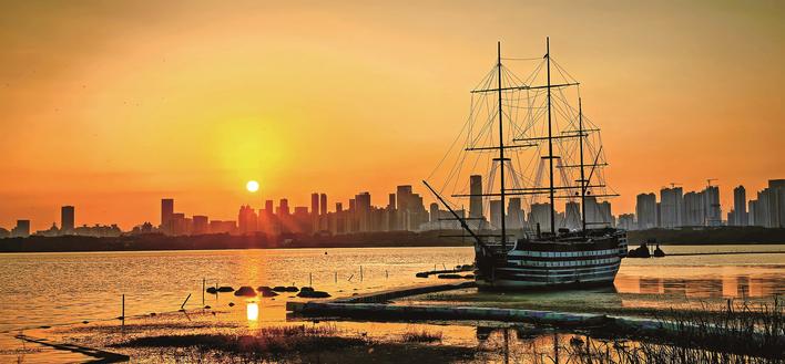 10月22日,武汉市东湖风景区在夕阳和晚霞的映衬下,壮美如画。新华社发