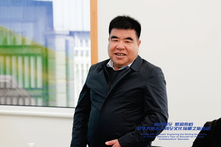 陕西省西安市周至县楼观镇周一村党支部书记齐平向驻华大使夫人介绍周至猕猴桃的特点及产业情况