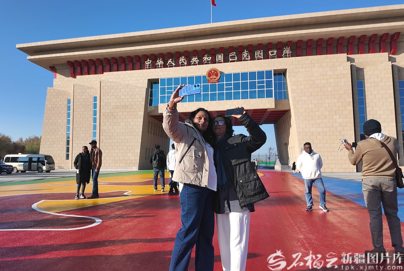 10月20日,斯里兰卡人民解放阵线代表团成员在塔城地区巴克图口岸拍照打卡。张成林摄
