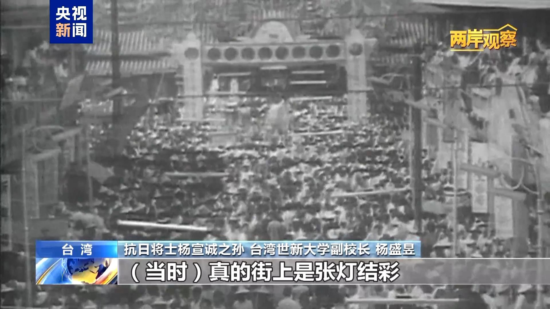 “张灯结彩喜洋洋,台湾光复不能忘”,抗日将士杨宣诚之孙、台湾世新大学副校长杨盛昱接受《两岸观察》记者采访时,唱起《台湾光复纪念歌》。他回忆说,这首歌他们从小到大基本都会唱,当时街上真的是张灯结彩,人们是自发自愿、非常动心动情地在庆祝这一天。