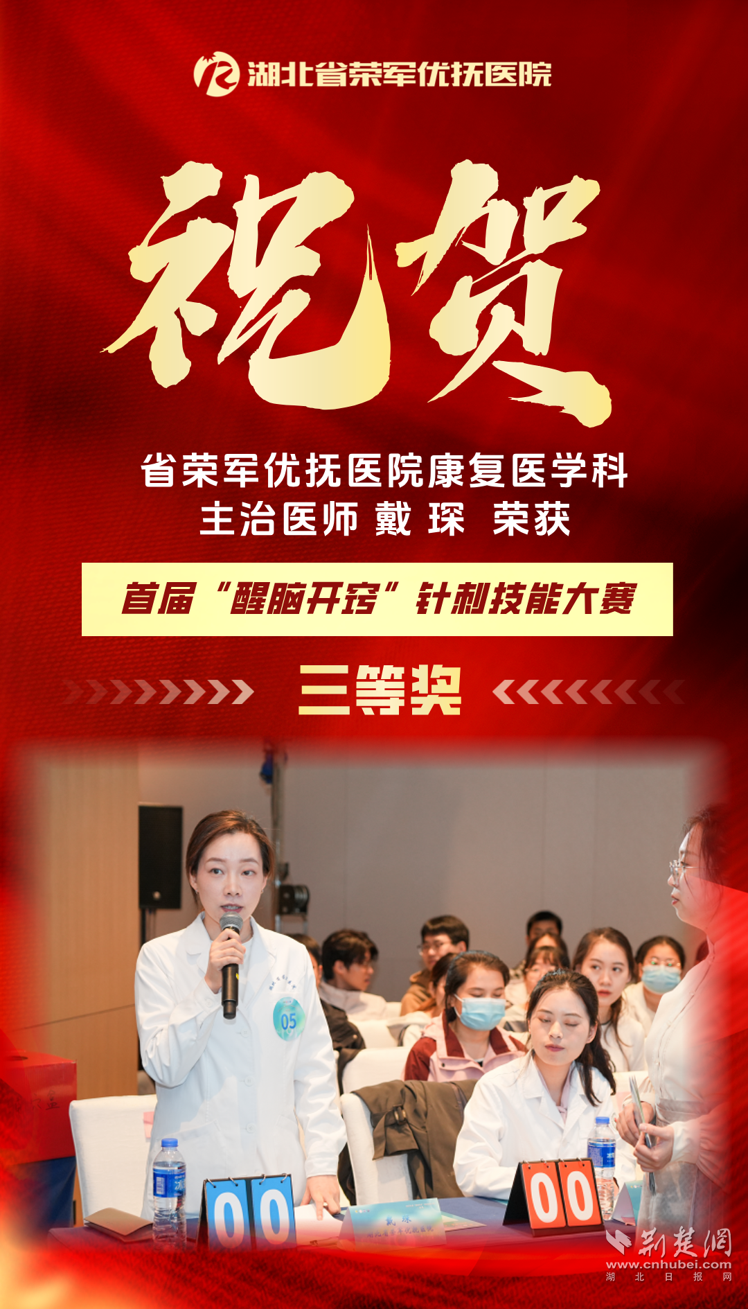 荆楚网(湖北日报网)讯(通讯员袁鸣)近日,首届“醒脑开窍”针刺技能大赛在天津举办。湖北省荣军优抚医院康复医学科主治医师戴琛凭借扎实的理论功底与娴熟的针刺手法,从全国众多参赛选手中脱颖而出,荣获大赛三等奖。