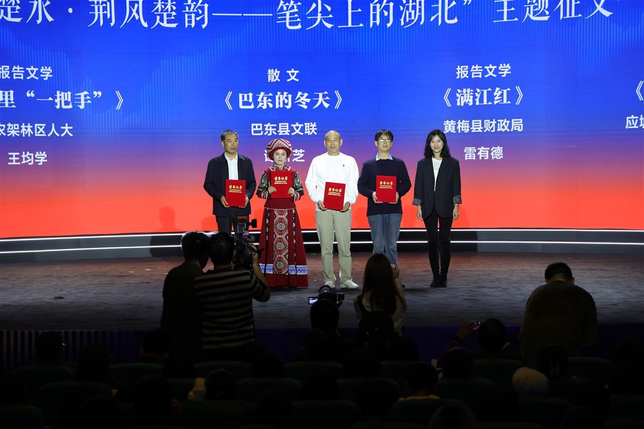晚会现场,还发布了由湖北省作家协会主办的“荆山楚水•荆风楚韵——笔尖上的湖北”主题征文活动优秀作品。征文启动以来,吸引全国文学爱好者踊跃参与,共收到投稿1842篇,经评审,最终评出一等奖4名、二等奖10名、三等奖20名、优秀奖50名。作品题材广泛、风格多样,涵盖生态文明、乡村振兴、城市记忆、文化传承等多个领域,生动书写新时代的荆楚故事与人民心声。