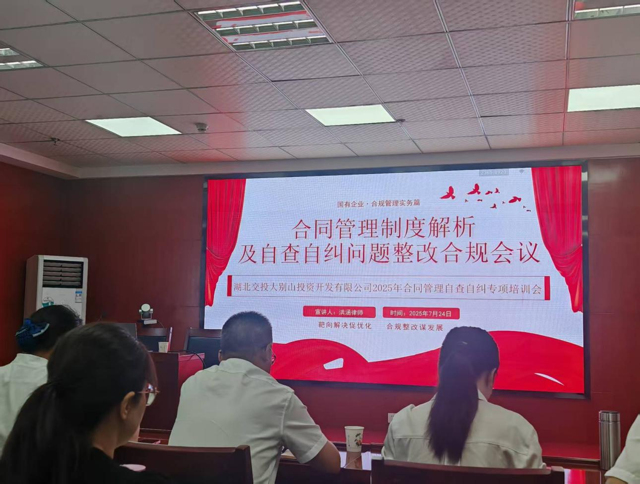 合同管理是风险防控的重中之重,7月24日,湖北交投大别山投资开发有限公司举办合同管理与招采管理专题培训,党委委员、副总经理姜国权主持开班,投资发展部组织合同全流程与招采规范授课;10月15日,该公司再次联合湖北立丰律师事务所洪涵律师开展法务知识培训,围绕《民法典》及典型案例深入讲解合同签订、履行、诉讼等关键环节。年内累计开展多轮培训,参训人员达150人次,显著提升业务人员的风险识别与合规操作能力,从源头筑牢合同风险屏障。