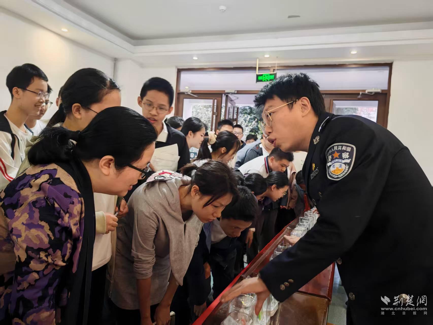活动伊始,同学们便被精心布置的禁毒模型和宣传展板所吸引。在禁毒模型讲解与展板解说区,武汉市司法局第二强戒所民警结合仿真毒品模型,用通俗易懂的语言向同学们详细介绍了常见毒品、新型伪装毒品的种类及其特征,深刻揭露了毒品对个人身心健康、家庭幸福和社会稳定的巨大危害。同学们认真聆听,仔细观察,面对形态各异的毒品模型,发出了阵阵惊叹,也更加直观地认识到毒品的欺骗性与隐蔽性。