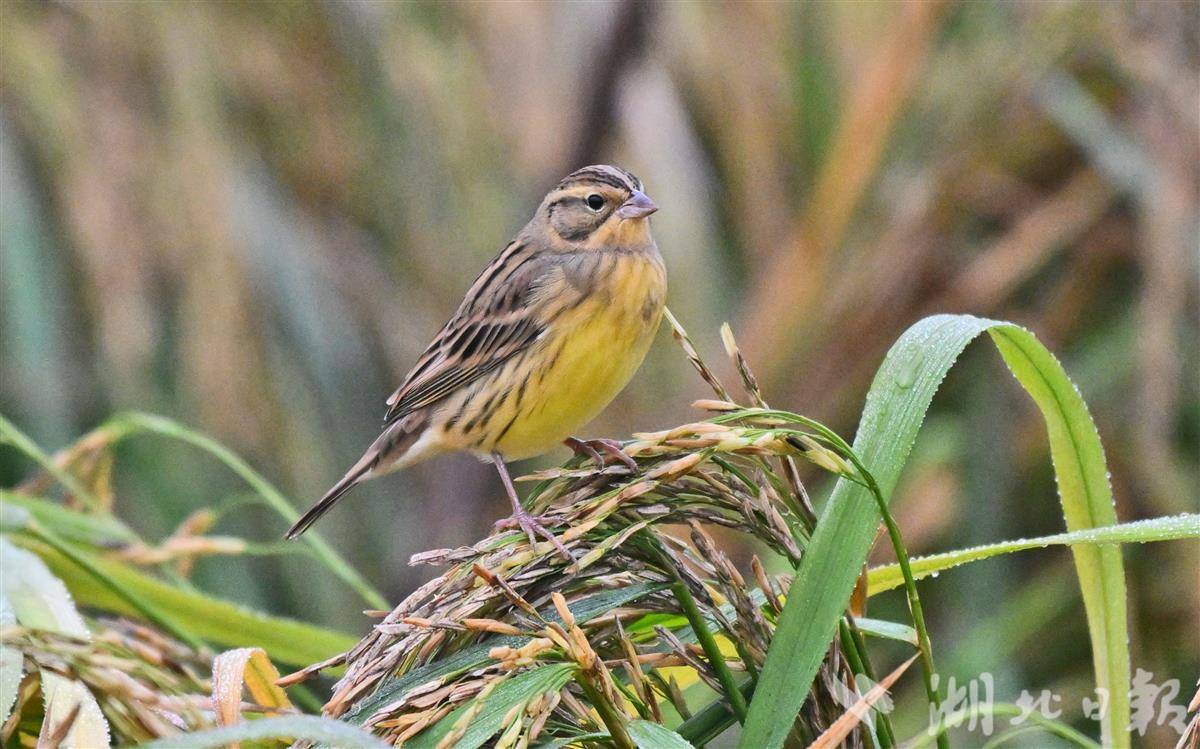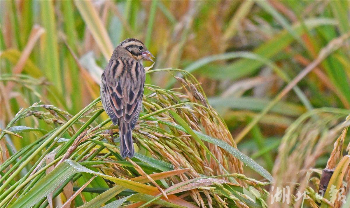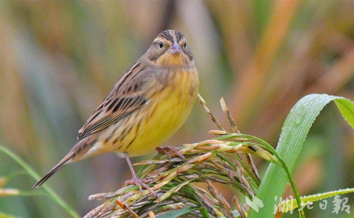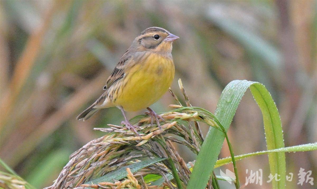 10月23日,记者于宜昌市卷桥河湿地一片观赏性稻田中,拍摄到国家一级重点保护野生鸟类——黄胸鹀(俗称“禾花雀”)。该鸟属于典型的河谷草甸灌丛草地鸟类。黄胸鹀于2017年被世界自然保护联盟提升为“极危”等级,2021年起被正式列为中国国家一级重点保护野生动物。近年来,宜昌市持续推进湿地生态保护与修复,全市湿地面积达8.24万公顷。卷桥河湿地通过植物修复、生物清淤及自然护坡等措施,重构了健康稳定的岸线生态系统,该湿地已连续四年观测到成群的黄胸鹀在迁徙途中经停此地。(湖北日报全媒记者 刘曙松 摄)