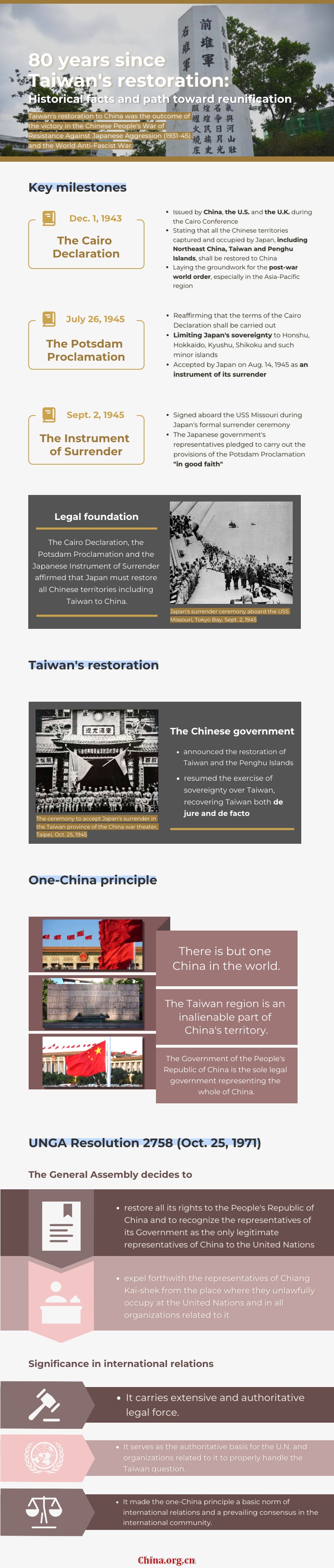 Editor's note: Oct. 25, 2025 marks the 80th anniversary of Taiwan's restoration to China. This infographic traces the key historical milestones leading to Taiwan's return to the motherland and highlights the legal and institutional foundations underpinning China's sovereignty over the island.