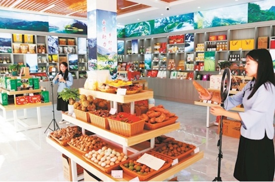 这样的转变,源于当地乡村产业与电子商务的深度融合。“我们建设专业化电商产业园,主动对接线上主流销售渠道,着力打造农场直播间、培养本土主播团队。”寻味盛康电子商务有限公司总经理刘洪说:“目前,我们电商产业园可展销农产品200多种,能容纳60位主播同时直播带货,常温仓库及冻库可储存农副产品一万吨,可有效解决盛康镇及周边地区农副产品销售、储藏等问题。”