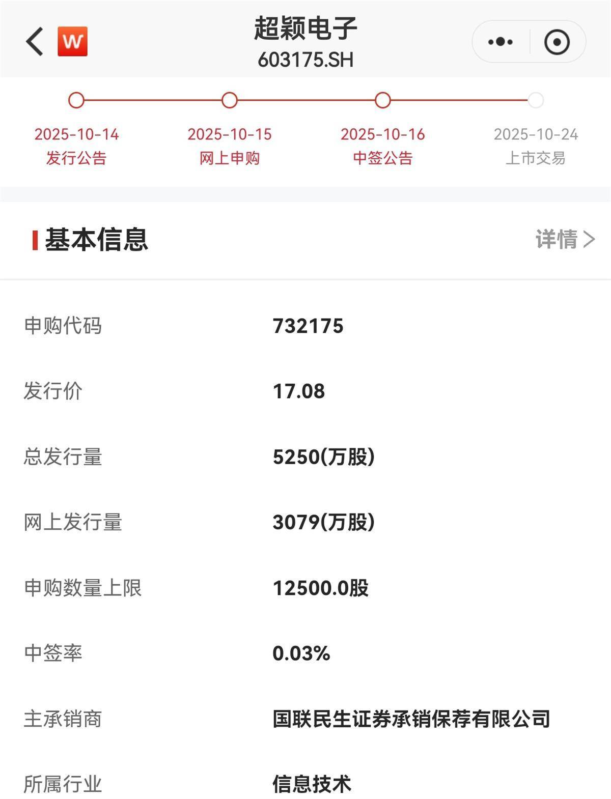 超颖电子本次公开发行股份数量为5250万股,占公司发行后总股本的比例为12.01%,发行价格为17.08元/股。