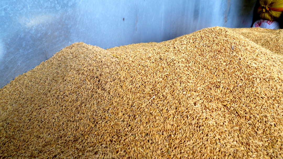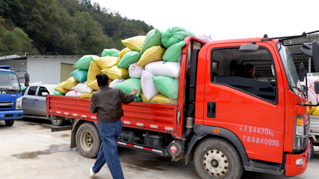 10月22日,平均海拔1000米的黄粮镇寒风刺骨,该镇金家坝村二组村民岳华红和丈夫张强拉着一车今年刚收割的稻谷,前往四月青公司粮食收购点售卖。