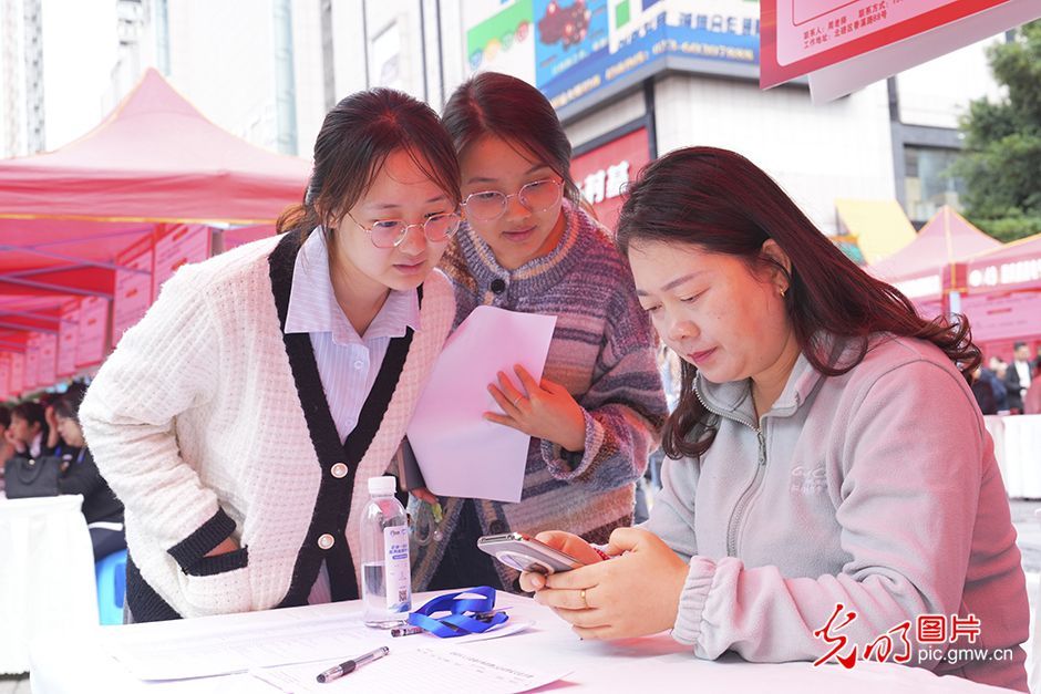 重庆市北碚区人力社保局启动2025年金秋招聘月活动,邀请100多家来自装备制造、新能源、数字信息、现代服务等企业参与,为求职者提供就业岗位近2000个,促进劳动者就近就地就业,助力企业发展。图为求职者在了企业用工信息。(秦廷富摄/光明图片)