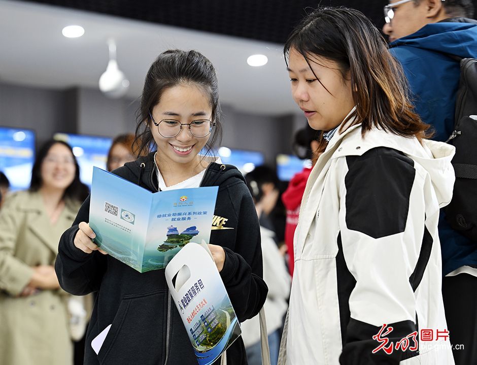 山东省青州市举办秋季企业推介暨人才招聘会,50余家企业提供了涉及机械数控、电子商务、家政餐饮、健康养老等领域近3000个岗位,吸引了许多求职者前来咨询应聘。图为求职者在了解岗位信息。(王继林摄/光明图片)