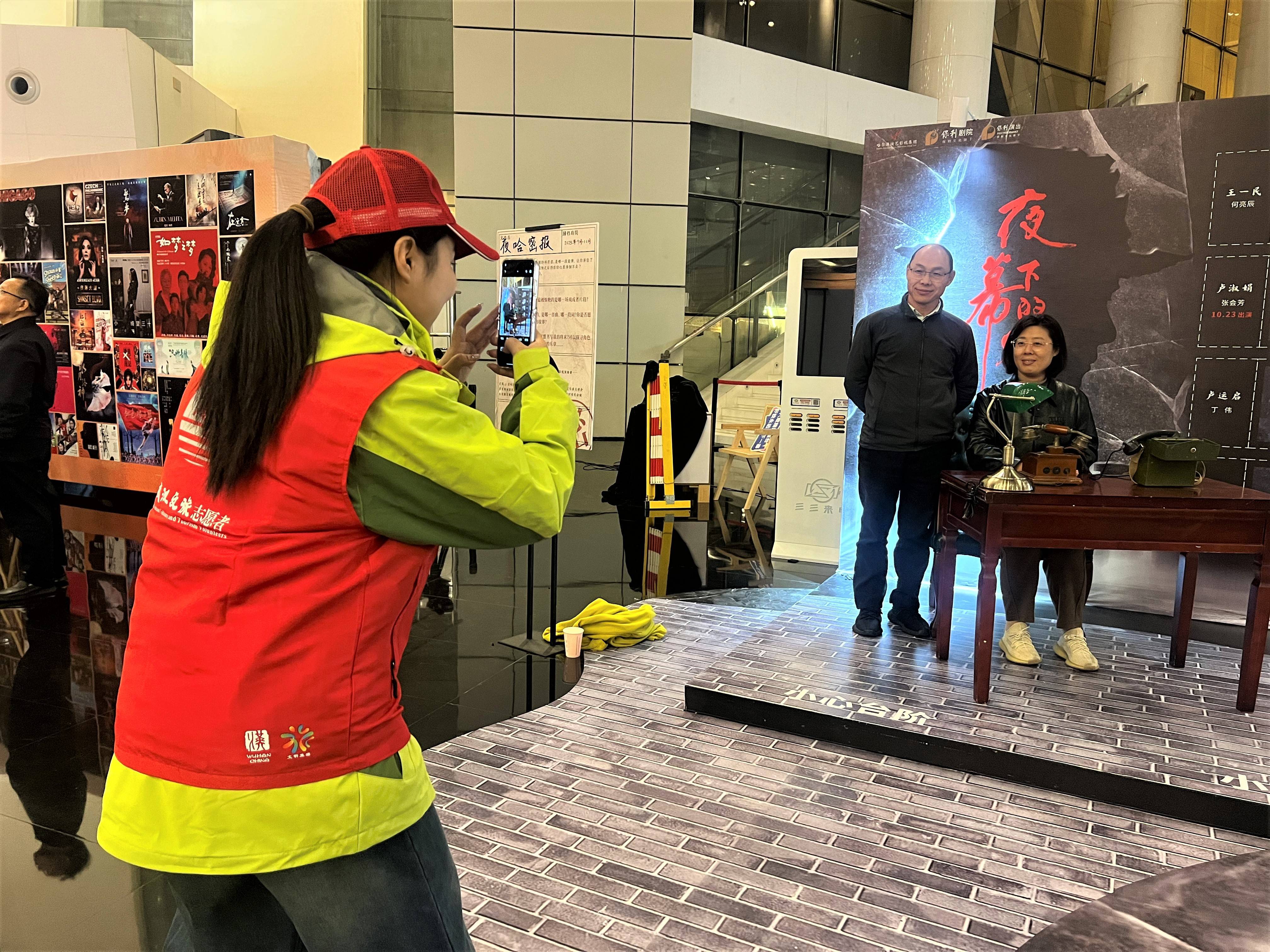 大厅放有一张根据《夜幕下的哈尔滨》场景还原的桌子,上面放有旧式电话、台灯等,营造出复古氛围,引起很多观众的青睐,纷纷上前拍照打卡。志愿者们接过观众的手机变身“摄影师”,认真地调整角度,帮他们定格这珍贵的记忆。
