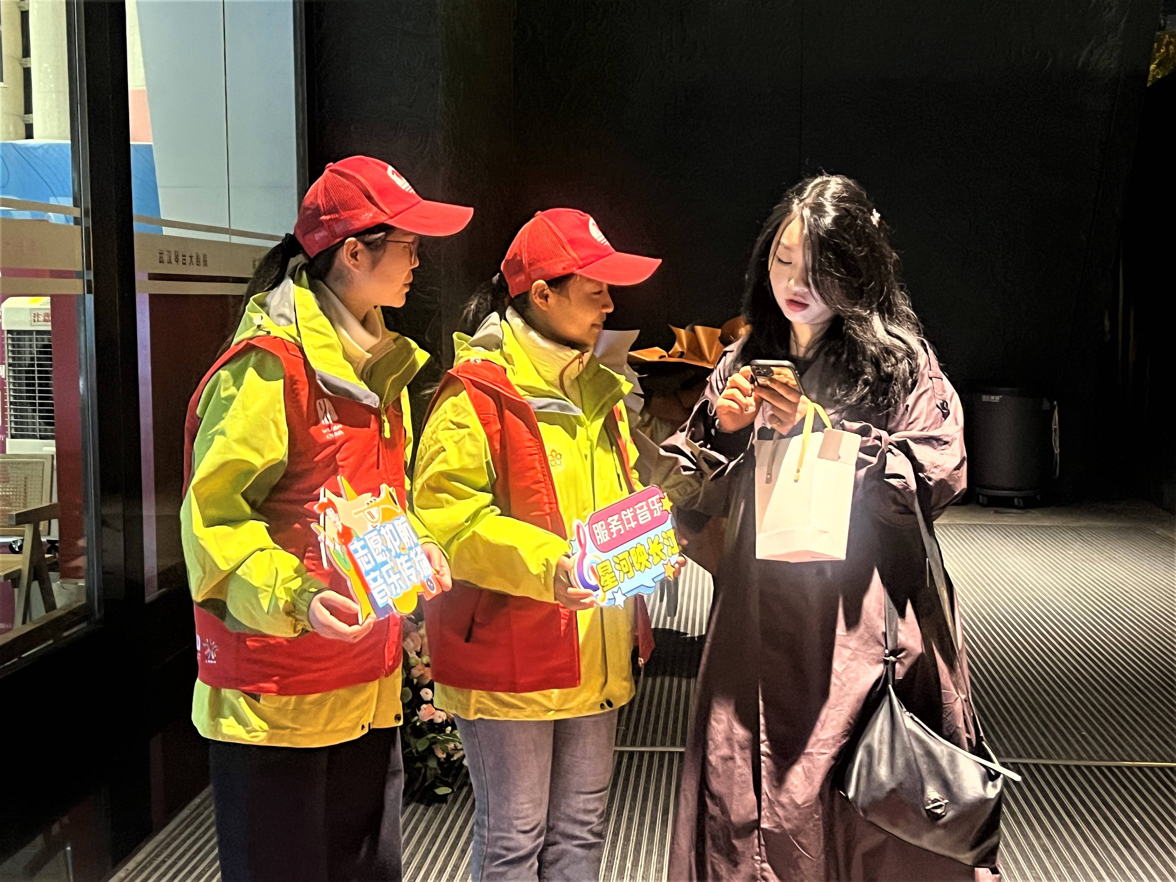 “您好,需要帮您介绍这部音乐剧的故事背景吗?”“取票请往这边走!”“卫生间请往这边走!”……面对陆续赶到的观众,手持“音乐为桥 江城添彩”“武汉文旅志愿者”等手牌的志愿者,在人群中十分显眼,他们有的准确指路,有的发放宣传单并耐心解答,有的协助工作人员检票,还不忘提醒大家文明观演,演出时不要随意走动以及拍照、拍视频等。