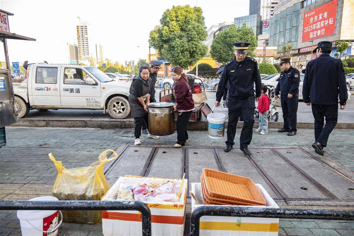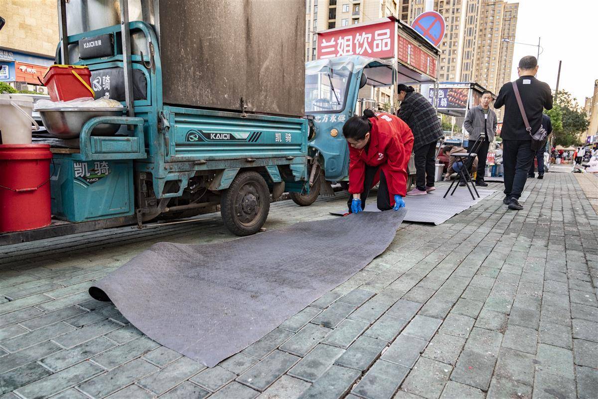 他们提出标配“三个一”措施,即要求每个摊贩配齐一套扫把簸箕、一套分类垃圾桶以及一套有效的防污垫。尤为暖心的是,黄陂区城管局统一采购并定制了标准防油污地垫,免费发放给摊主使用,还现场指导铺设,确保整齐划一、有效防污。很快,曾经脏乱的地面和斑驳的油污便不见了踪影,整条街道展现出干净整洁的新面貌。