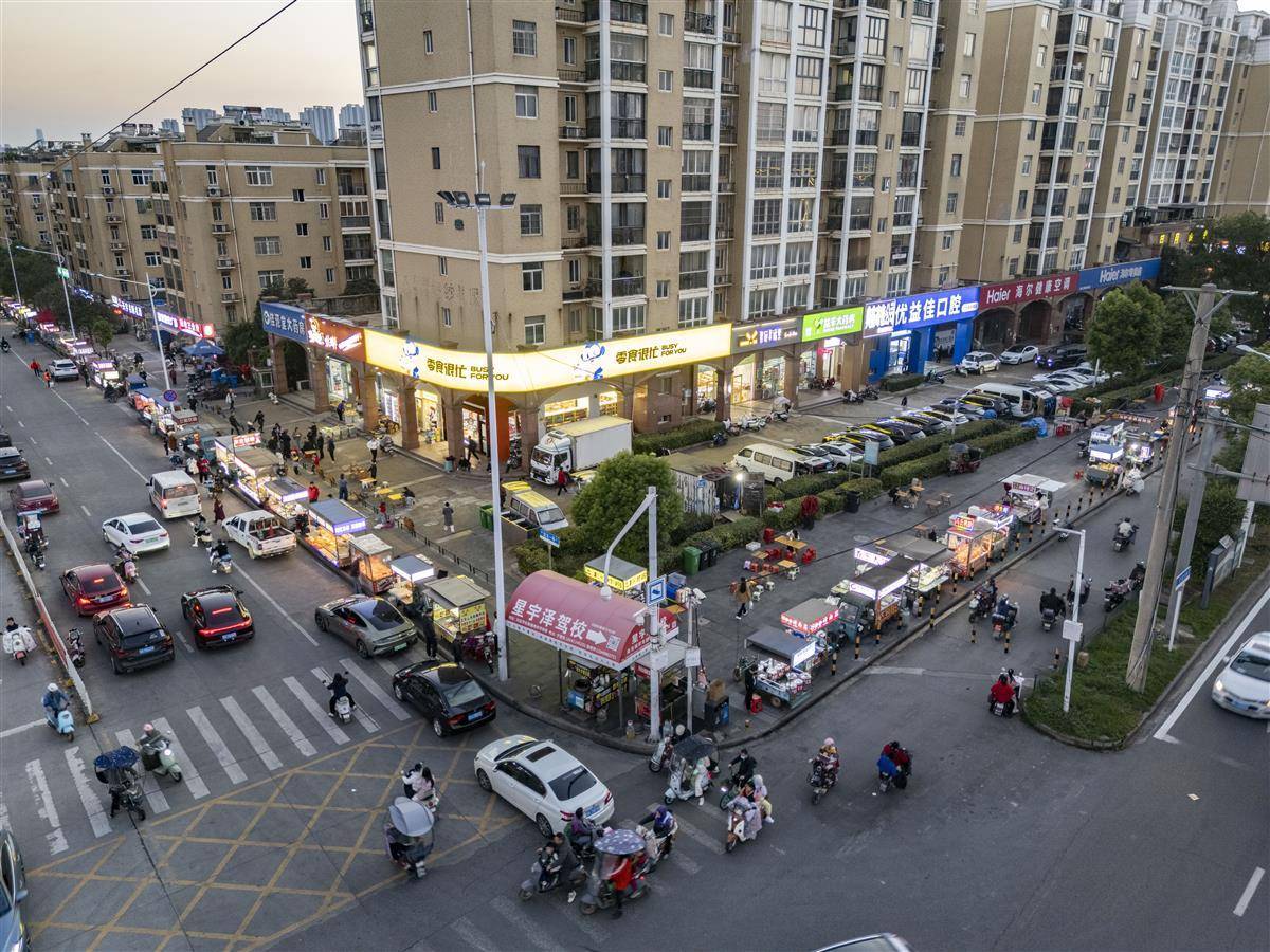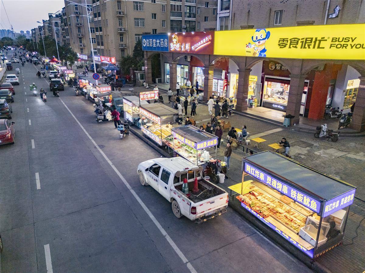 这片自发形成的夜市摊点长约260米,汇聚了50余家固定摊位。周边环绕着万达广场等商业综合体及多个大型居民区,旺盛的消费需求使其充满活力,但也带来了交通拥堵、地面油污等突出的“城市病”。