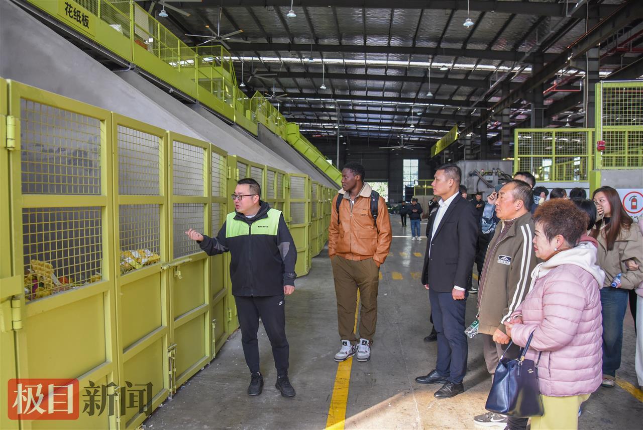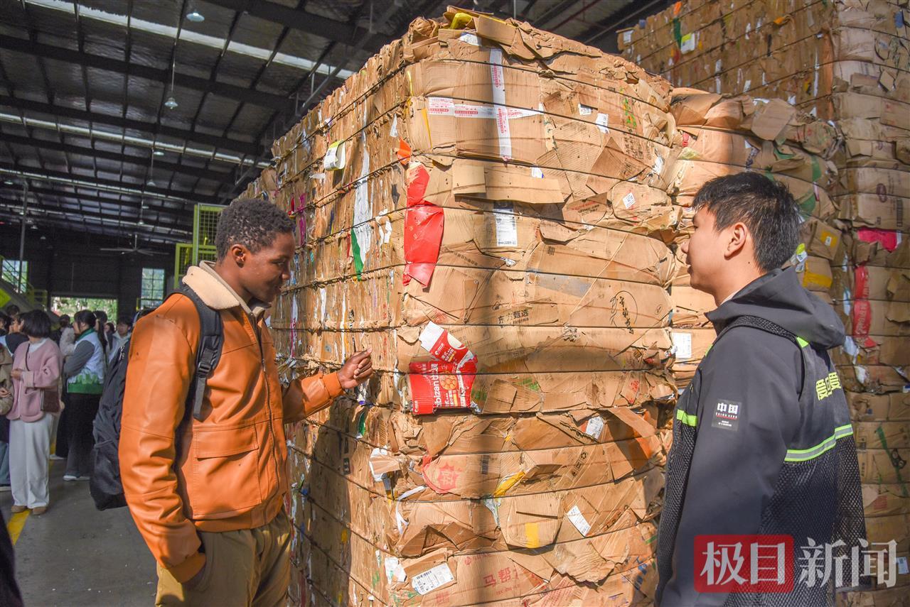 10月22日,荆州市生活垃圾分类企业开放日活动现场,喀麦隆驻华留学生K.S.Pavel在爱回收·爱分类荆州市可回收物分拣中心了解分拣流程(极目新闻记者 黄志刚 摄)
