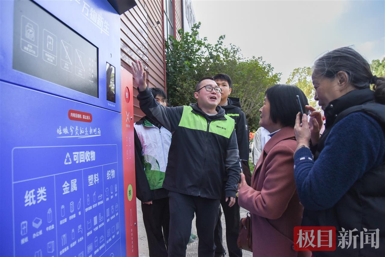 10月22日,荆州市生活垃圾分类企业开放日活动现场,爱回收·爱分类荆州市可回收物分拣中心工作人员演示智能可回收物箱使用方法(极目新闻记者 黄志刚 摄)