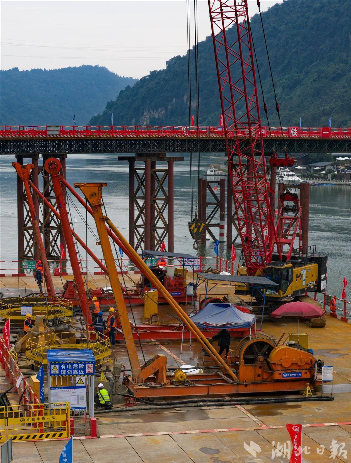 10月 22日,宜昌至涪陵高铁(长阳段)长阳清江特大桥主塔工地机械轰鸣不断,施工现场呈现出热火朝天的建设景象。