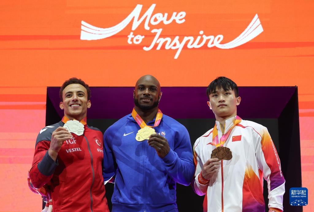 10月24日,冠军美国选手惠滕伯格(中),亚军土耳其选手阿西尔(左),季军中国选手兰星宇在颁奖仪式上。