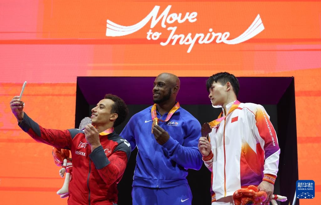 10月24日,冠军美国选手惠滕伯格(中),亚军土耳其选手阿西尔(左),季军中国选手兰星宇在颁奖仪式上自拍。