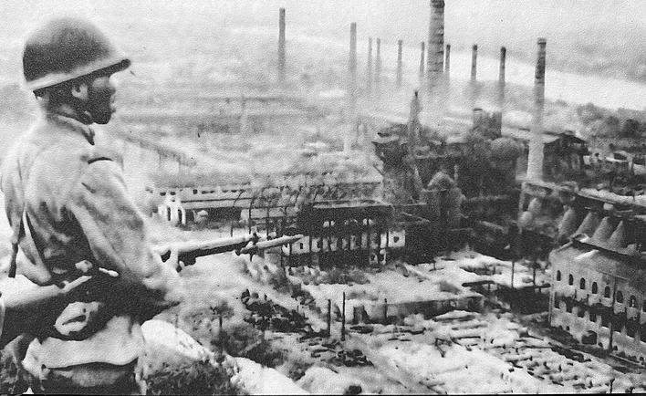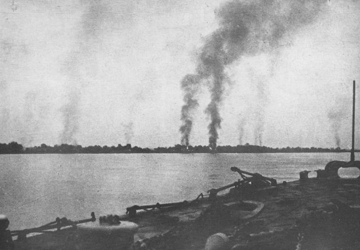 1938年10月,侵华日军随军记者从武昌江边拍摄的被焚烧的汉口城区。(扫描自1938年日本出版的《世界画报》)