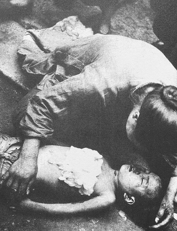 1938年,被日机炸死的武汉儿童,母亲在旁边痛哭。(翻拍于八路军武汉办事处旧址纪念馆)