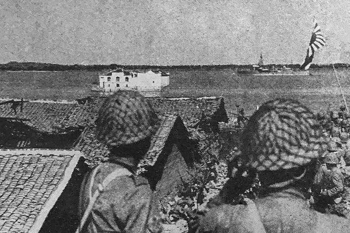1938年,武汉外围战场,侵华日军在鄂城(现鄂州)长江边眺望观音阁,远处是巡弋的日本军舰。(扫描自1938年日本出版的《世界画报》)