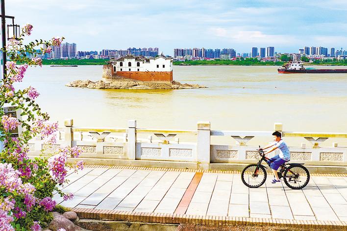 2025年8月1日,鄂州,孩子骑车经过花开正盛的长江江滩,江心的观音阁依旧屹立,对岸的黄冈城区高楼林立。
