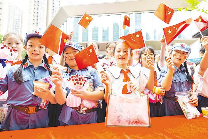 2025年9月29日,武汉市小学生挥舞国旗,在欢声笑语中迎接国庆节的到来。