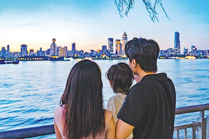 2025年8月22日,武汉一家三口在武昌江滩远眺华灯初上的汉口城区。
