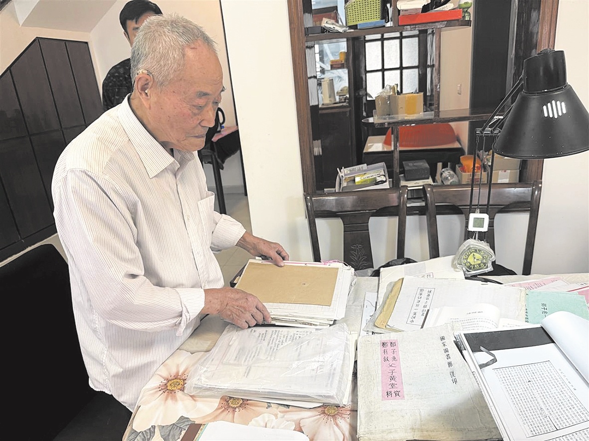 90岁的郑用威老人整理相关资料    摄影:楚天都市报极目新闻记者林楚晗