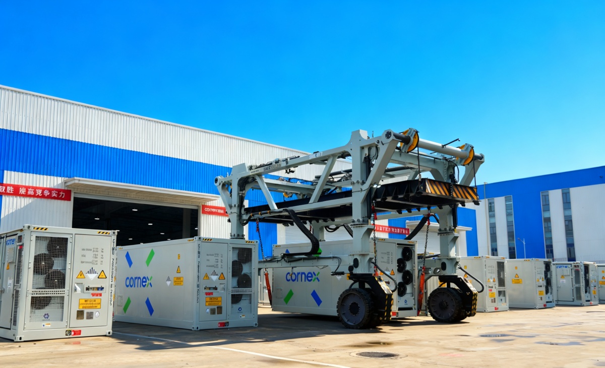 10月24日,204台标有“CORNEX”标识的20尺标准5MWh电池预制舱,陆续从宜昌楚能新能源生产基地鱼贯而出。(通讯员 金晓燕 摄)