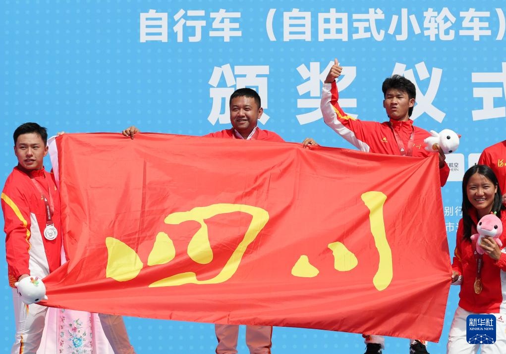10月25日,冠军四川队选手魏天旺(左四)、亚军四川队选手海洋(左二)、季军河北队选手张贺强(右二)和教练们在颁奖仪式上庆祝。