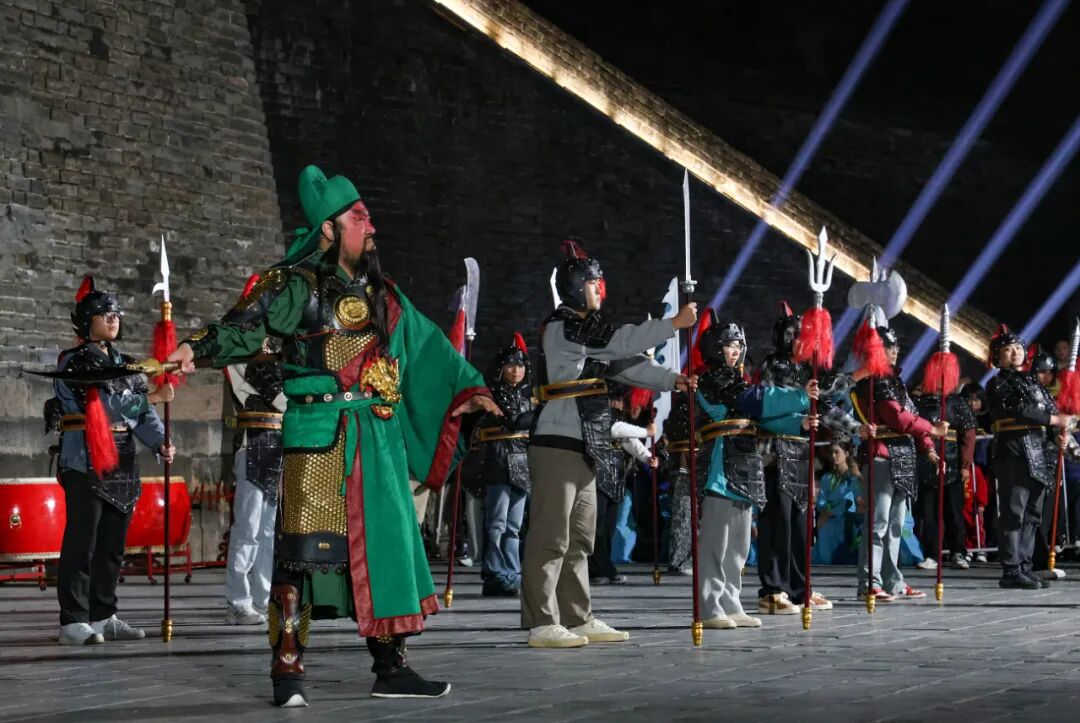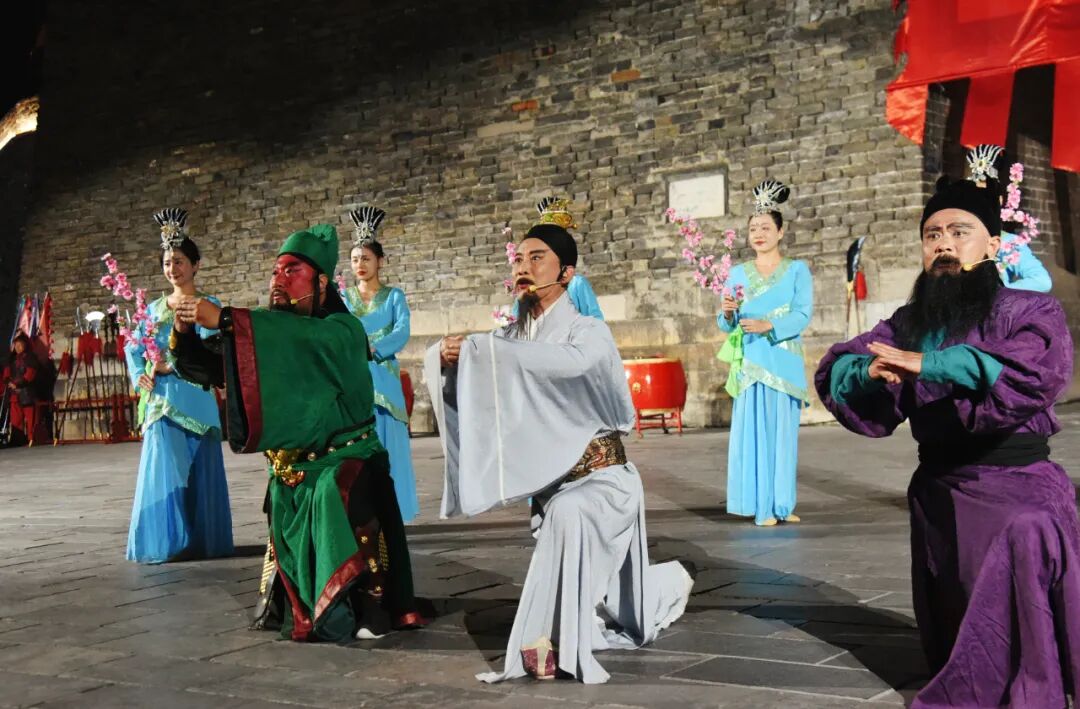 “刘关张”齐聚荆州,“三国风云”震撼上演。晚8时,《三国英雄路•我在荆州演三国》实景互动演出在荆州古城大北门拉开帷幕。