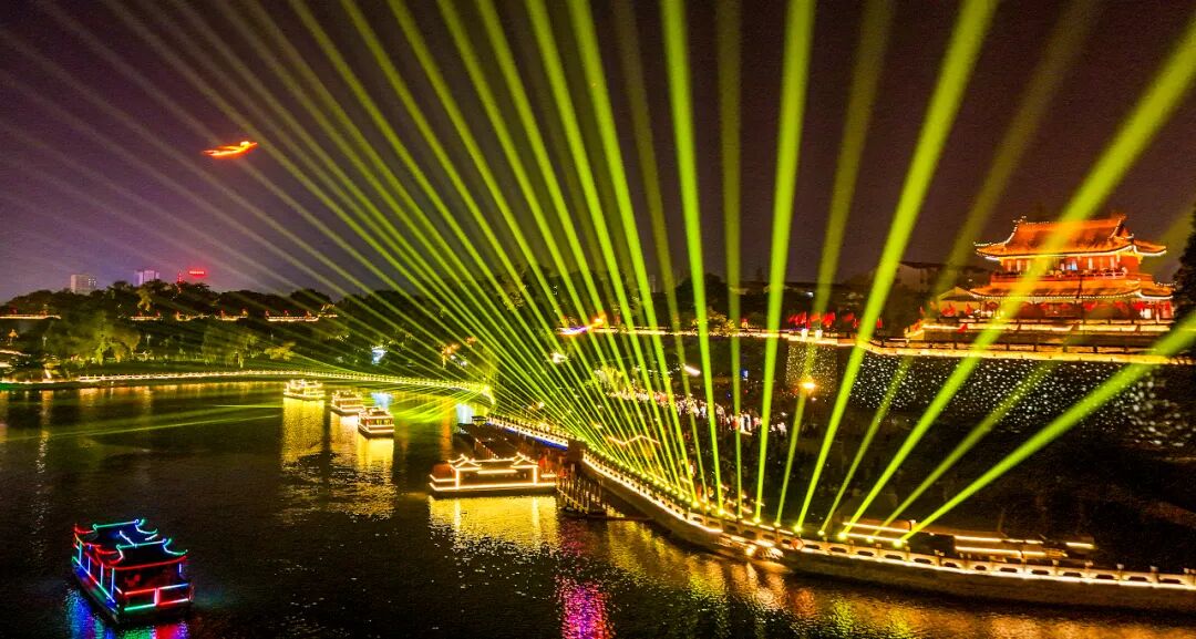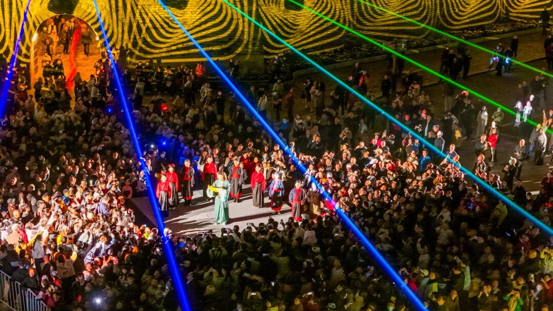 暮色四合,宾阳楼畔护城河上灯火渐明。晚上7时20分,激昂音乐响起,古城墙化身巨幅光影画布,演出正式开始。在悠扬的楚地古琴曲中,手持竹简的“屈原”行至河畔观景台中央,面向观众庄重行礼,将观众带入一个虚实交织的楚文化空间。