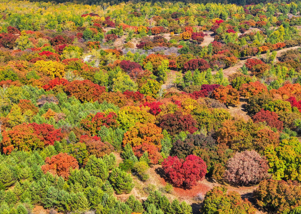 图为通辽市科尔沁左翼后旗的乌旦塔拉五角枫森林公园美景(无人机照片)。新华社记者 连振 摄