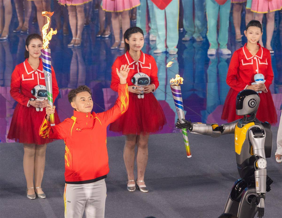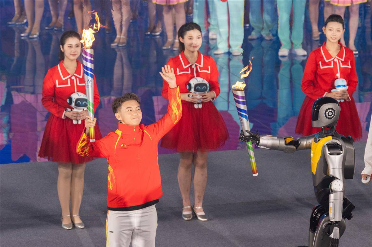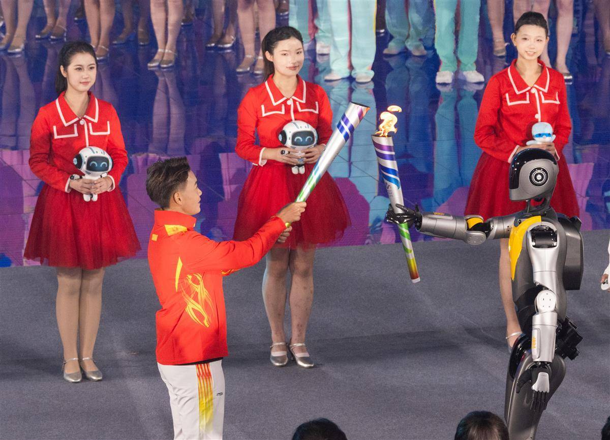 女足运动员王霜(左)和“光子”人形机器人完成火炬传递。