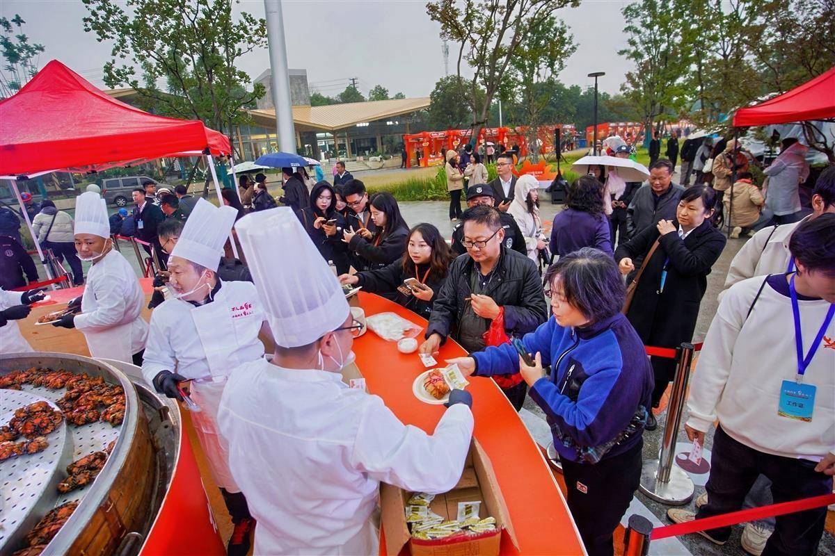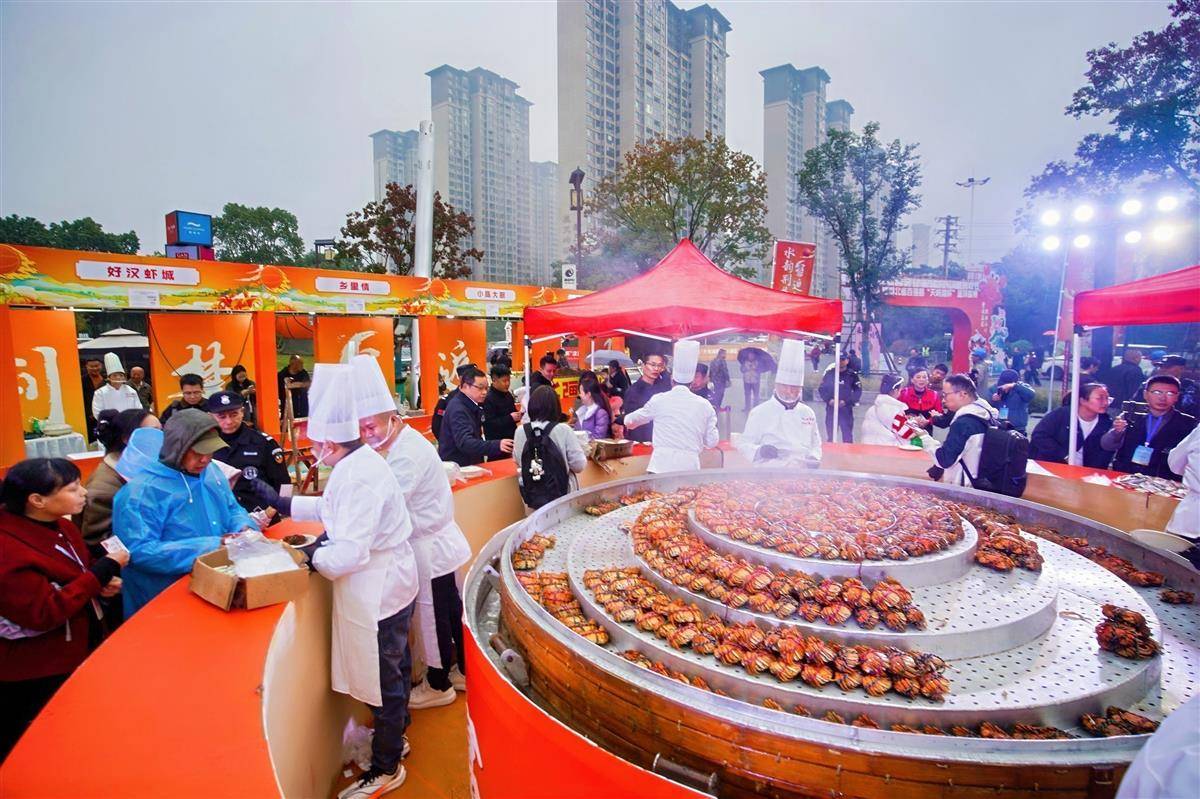 青壳白底金毛爪,个大肉鲜味道美。当晚,“万人品蟹”趣味宴在汉川市天屿湖旅游度假区热闹开席,随着直径2.8米的蒸笼被揭开,约1500只热气腾腾的螃蟹新鲜出炉。活动现场还设置了22个美食展位,推出香辣蟹、醉蟹等花式蟹肴及汉川特色小吃,吸引近2万名游客品尝。