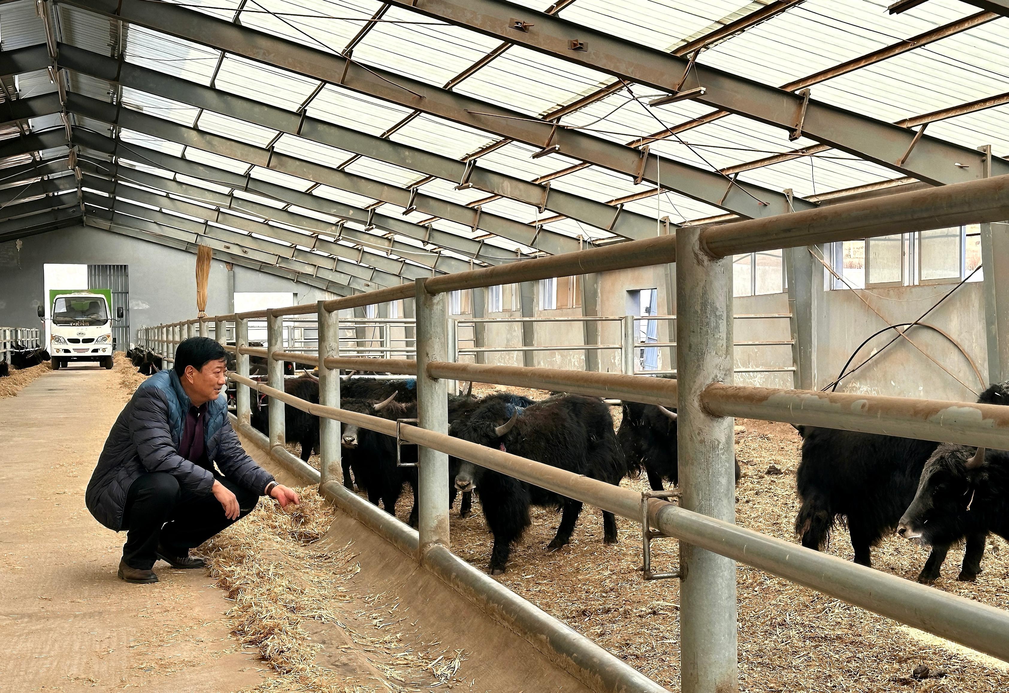 青海省大通牦牛种牛场场长殷满财在牛舍内查看牦牛的饲喂与生长情况。受访者供图