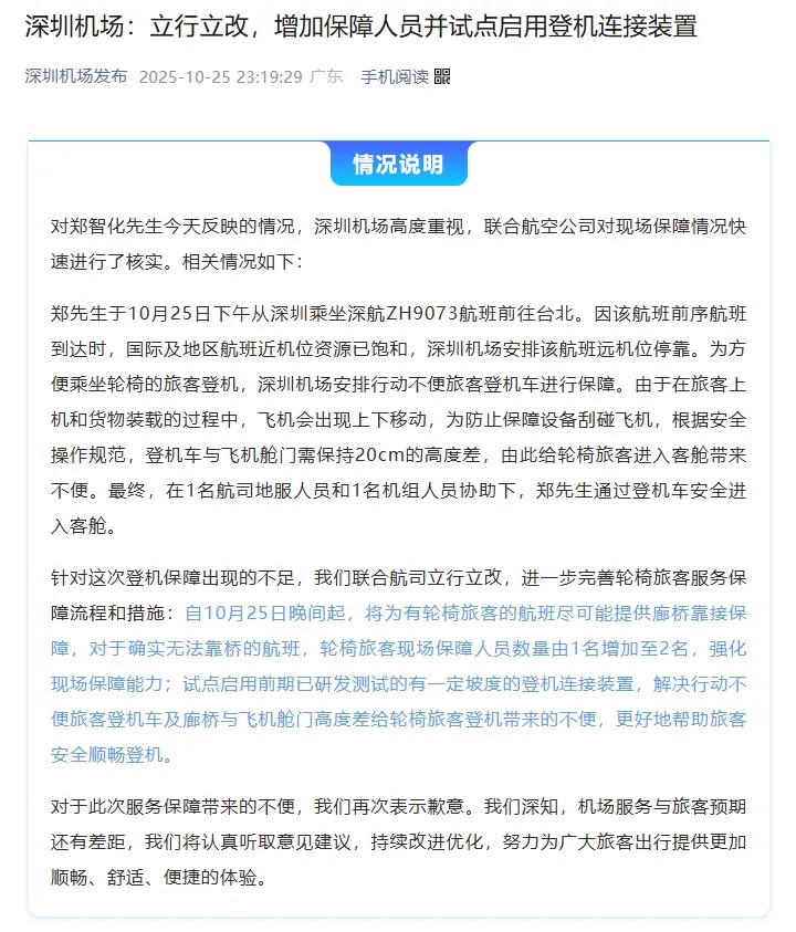 针对这次登机保障出现的不足,我们联合航司立行立改,进一步完善轮椅旅客服务保障流程和措施:自10月25日晚间起,将为有轮椅旅客的航班尽可能提供廊桥靠接保障,对于确实无法靠桥的航班,轮椅旅客现场保障人员数量由1名增加至2名,强化现场保障能力;试点启用前期已研发测试的有一定坡度的登机连接装置,解决行动不便旅客登机车及廊桥与飞机舱门高度差给轮椅旅客登机带来的不便,更好地帮助旅客安全顺畅登机。
