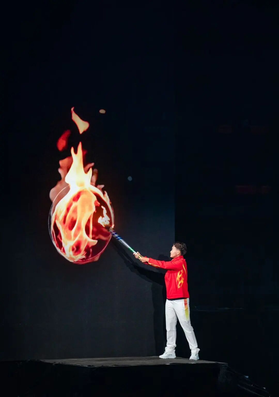 20时,火炬入场传递。武汉市游泳运动员艾衍含作为第一棒火炬手亮相,将火炬传递给第二棒火炬手光子机器人。当光子机器人稳稳停步,机械臂精准递出圣火,全场掌声雷动。车谷江大女足队员王霜接棒,擎炬前行,将火炬点在电子屏幕上,形成一个火苗,电子屏幕中的“长江江豚”从深水中跃出,将火苗顶出水面,顶至浩瀚的星空,点燃主火炬。千年文明之火,化作新时代创新之光,照亮车谷夜空。