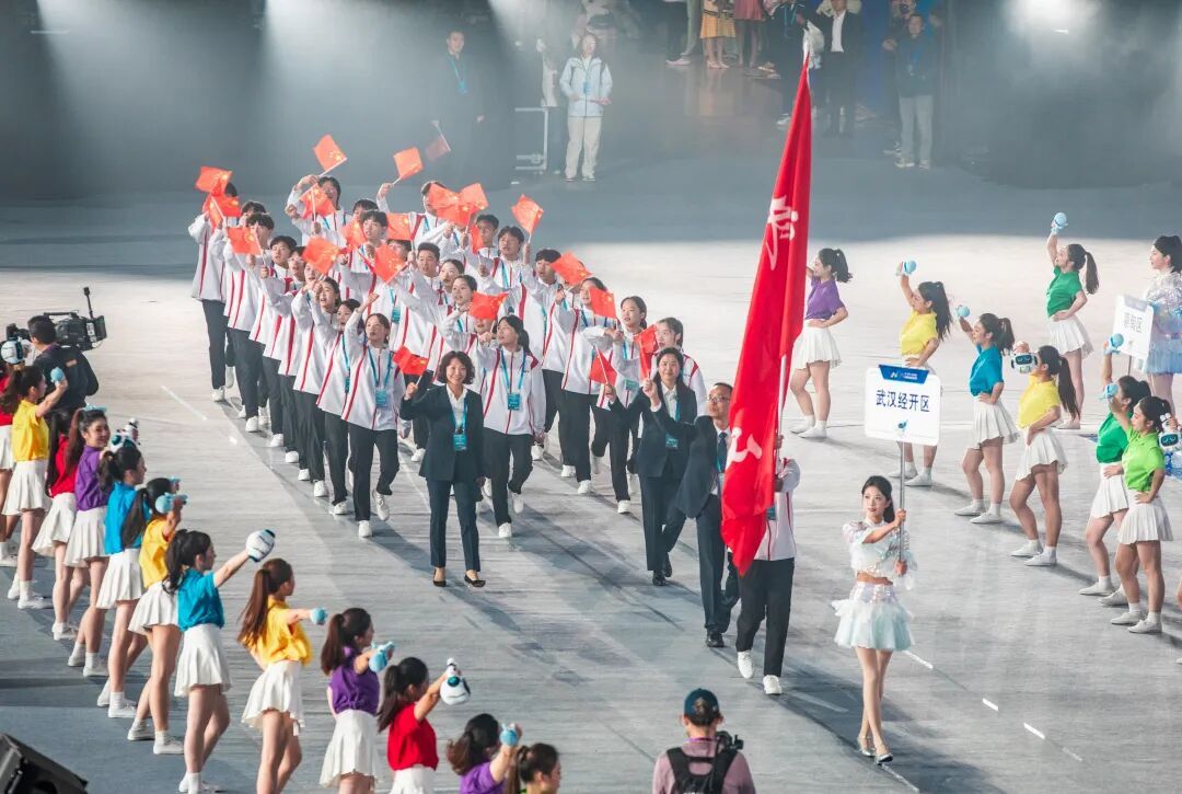 19时整,在现场观众热情的欢呼声中,24支体育代表团依次入场。武汉经开区代表团精神抖擞、口号嘹亮,以饱满热情展示着车谷健儿们的昂扬风采。