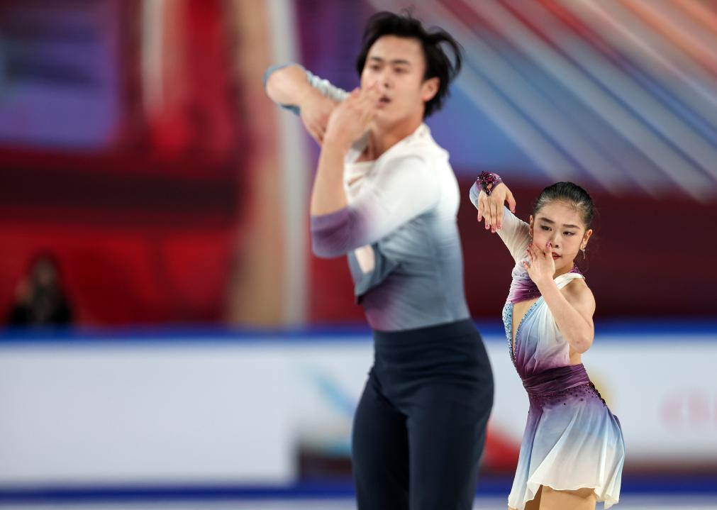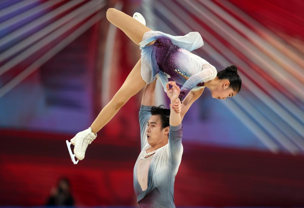 10月25日,中国组合张嘉轩(右)/黄一航在自由滑比赛中。最终,他们获得双人滑比赛第四名。