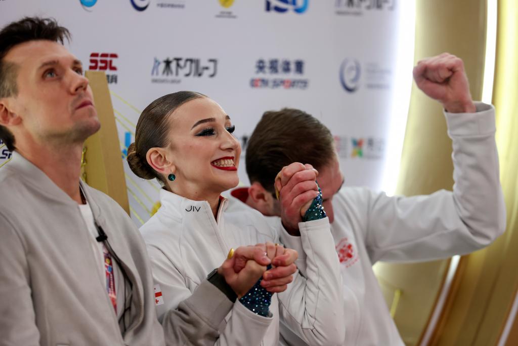 10月25日,格鲁吉亚组合阿纳斯塔西娅·梅特尔基娜(中)/卢卡·别鲁拉瓦(右)在等分席庆祝夺得双人滑比赛冠军。