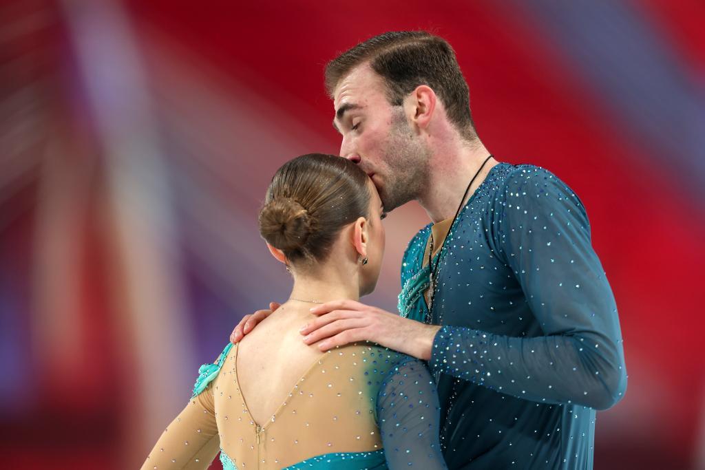 10月25日,格鲁吉亚组合阿纳斯塔西娅·梅特尔基娜(右)/卢卡·别鲁拉瓦在自由滑比赛中。最终,他们夺得双人滑比赛冠军。